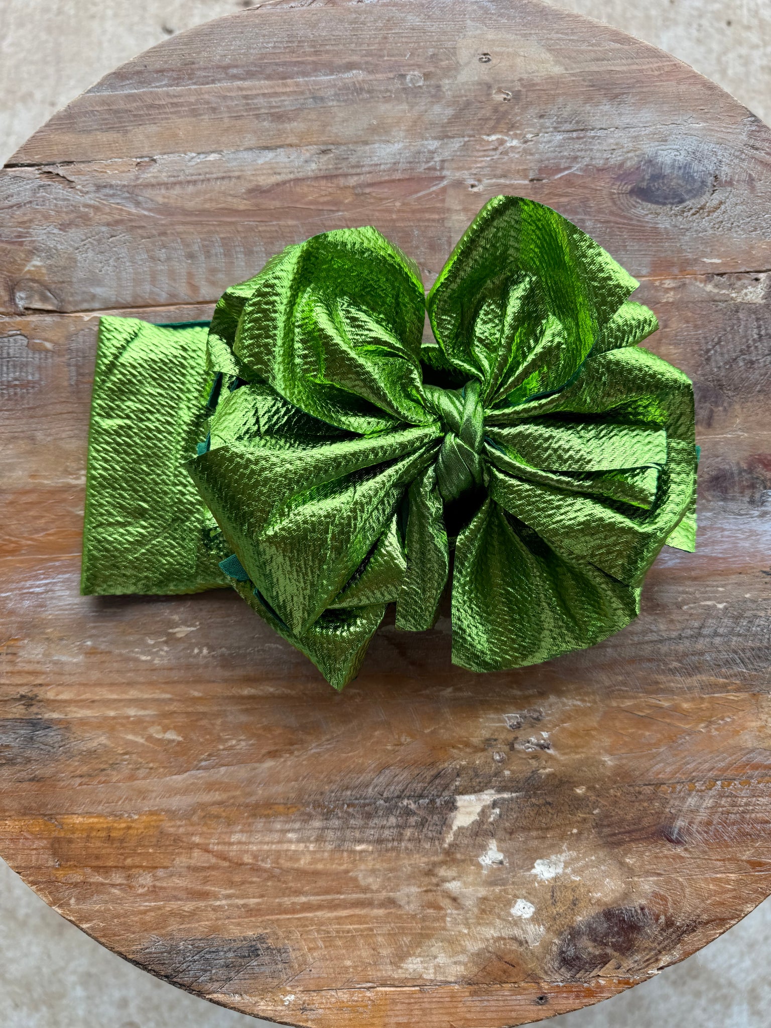 The bow measures approximately 7" wide x 6" tall. The band of the bow measures approximately 13" x 4"